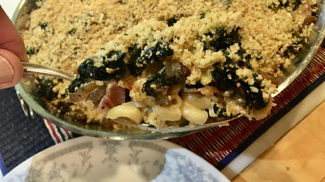 Busy Skillet Spinach, Ham and Macaroni Strata: Built by layering macaroni, ham, onions, mushrooms and spinach, interspersed with a creamy mustard sauce and cheese and topped with Panko crumbs, this sumptuous casserole is big enough to feed eight hungry people. All it needs is a salad to accompany it.