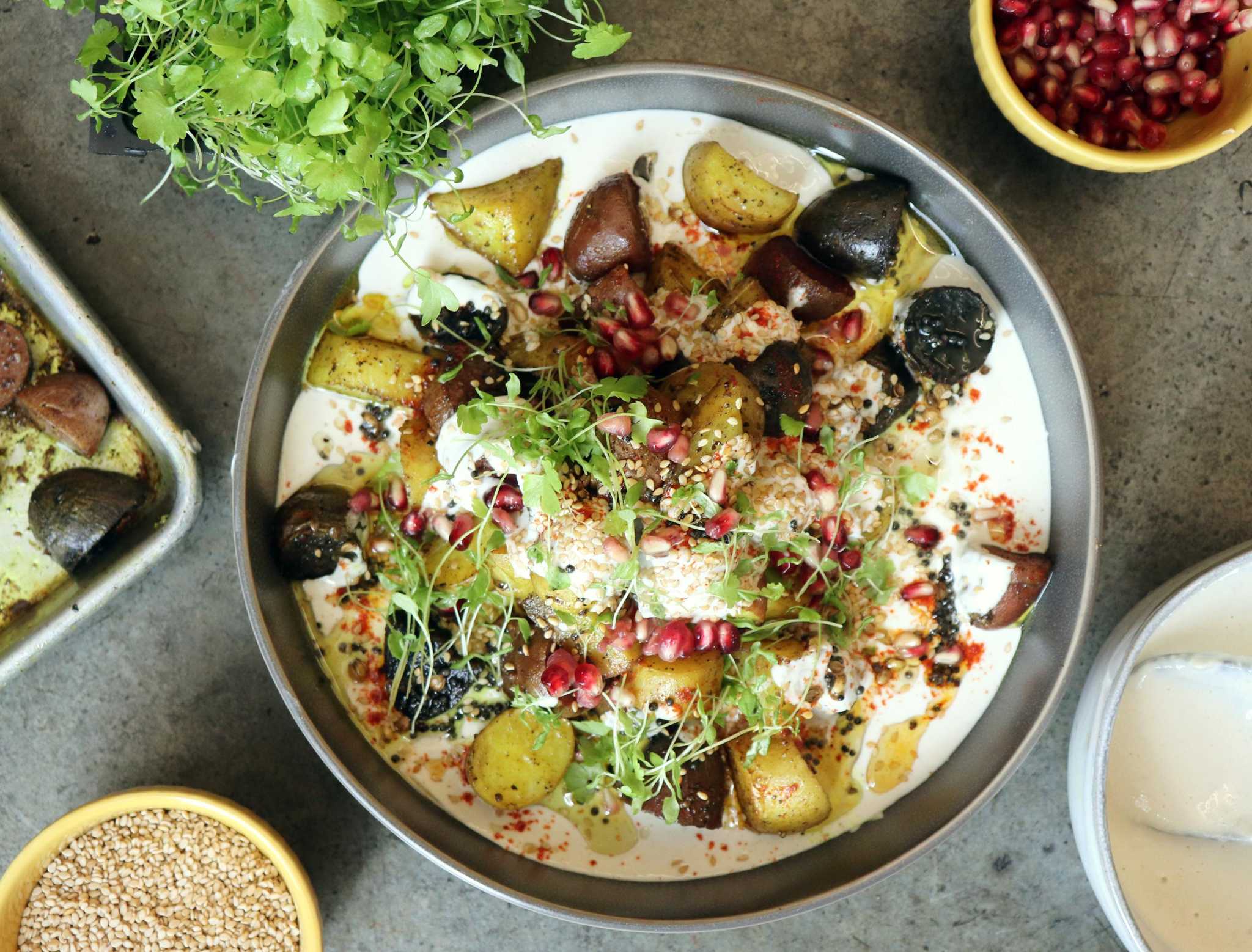 Last week, as my team at the restaurant urged me to come up with my own version of potato salad, I experimented with an entirely new idea, and it turned out almost good enough to be a main course. Roasted fingerling potatoes with a creamy yogurt, ginger and tahini sauce drizzle, a spice pop and fresh herbs on top. I love this version, look forward to making it again, and I hope you do, too.