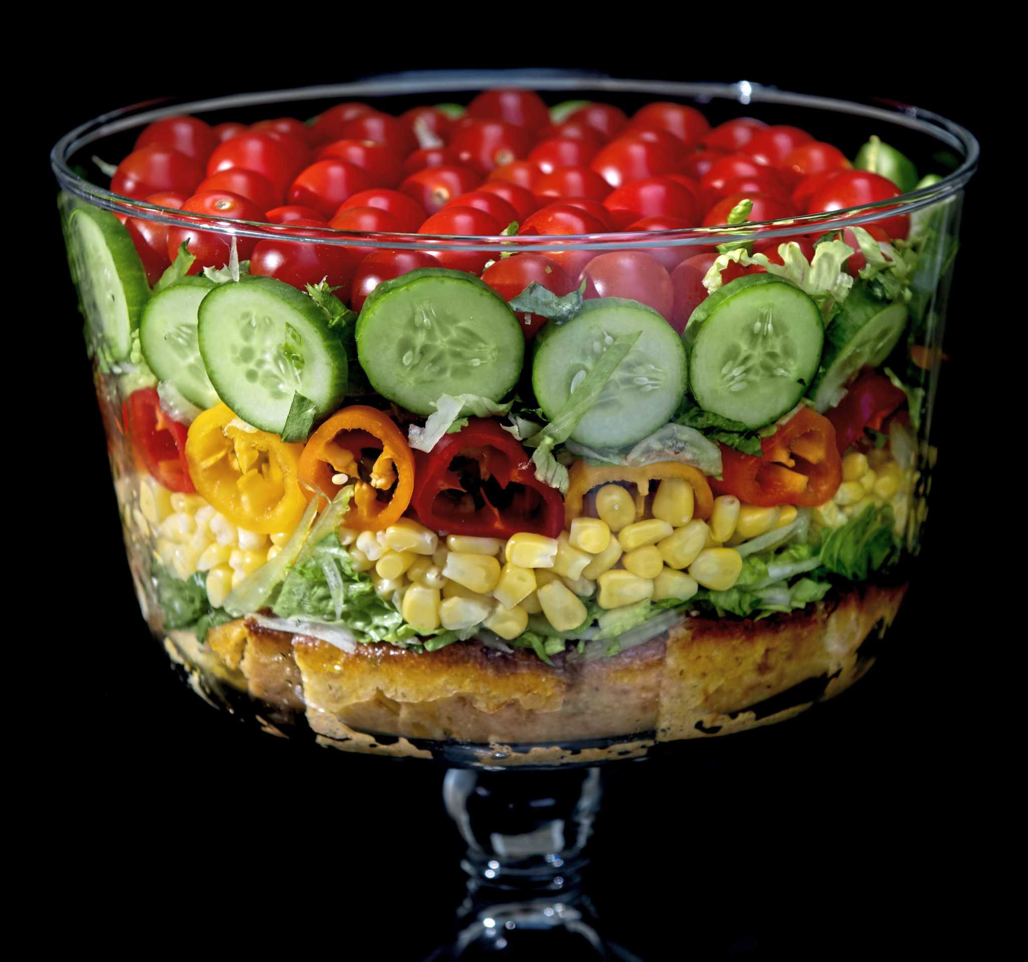 lessBuilt on a layer of savory cornbread, the summer trifle salad is made with shredded romaine lettuce, sweet corn, mini peppers, cucumbers and cherry tomatoes. Shot in Oakmont, Pennsylvania on Friday, Aug. 21,