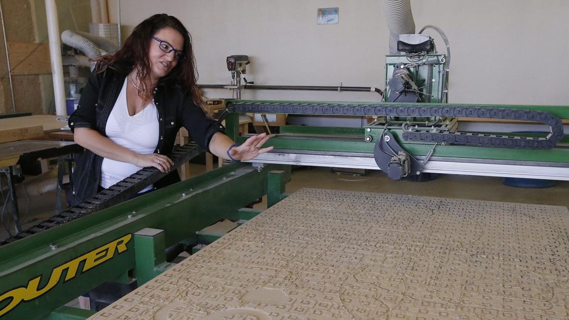 In this 2016 photo, Maker’s Edge co-owner Melissa Pardun shows off a CNC router, a computer-controlled machine that can carve intricate patterns. The business is making new plans to stay open after subdued traffic during the pandemic pushed the owners to consider closing.