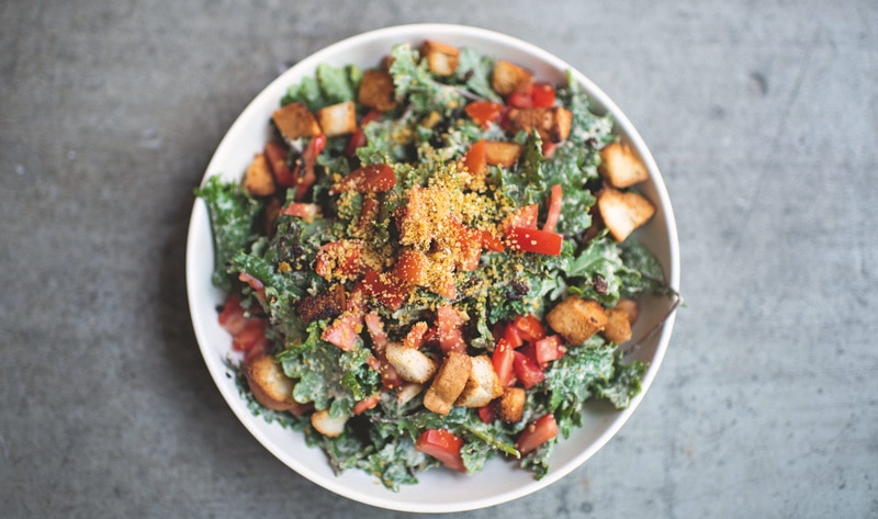 Thick, creamy dressing and fresh greens are paired with buttery, crunchy croutons and smoky vegan bacon bits for a flavor-forward vegan version of this classic salad in this recipe from the Eating for the Planet Cookbook. Add a meatier protein such as blackened tempeh or store bought vegan chicken to make it even heartier.