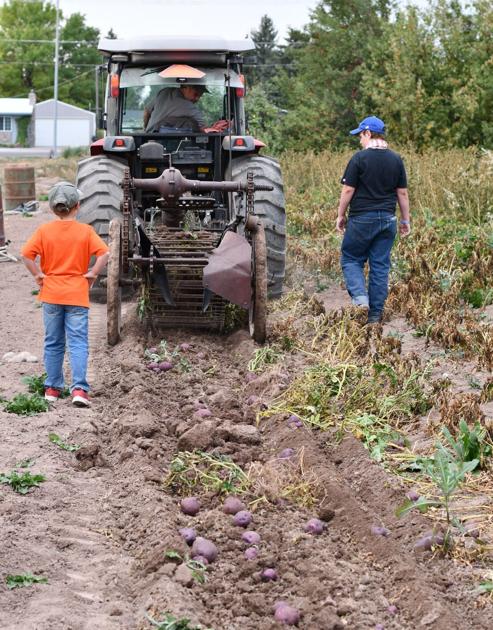 Pam Olsen of Ammon invited her customers and the public to visit her farm named “On the Sunnyside” to see her single-row, horse-drawn potato digger, estimated to be over 100 years old, in action. Although modified with an axle and transmission taken from Model A and Model T cars to be pulled with a small tractor, the experience transported visitors back to a simpler time.