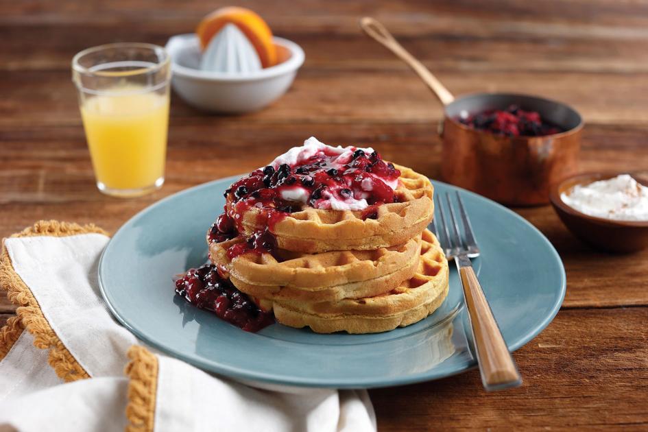 Sweet Potato Waffles with Whipped Cream and Berry Compote