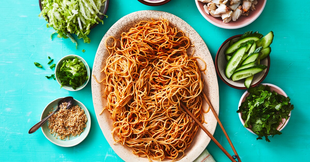 Crab meat adds sweetness to this peanut-rich sesame sauce bathing noodles and loads of sliced crunchy cucumbers and shredded cabbage.