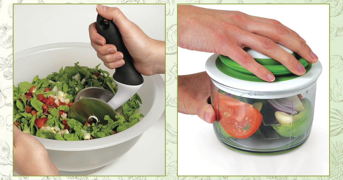 - Salad choppers: This compact option rolls like a pizza cutter and is slimmer and easier to store in a drawer than a mezzaluna; they can also easily be used to cut salad directly in a bowl. Look for nonslip handle to maneuver with ease.