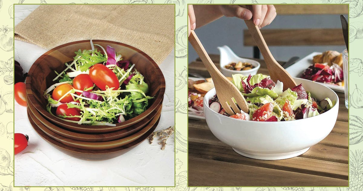 No matter your tablescape style, this set of large serving bowls fits in with any dinnerware set to display and serve salad (and more!). Vibrant greens and colorful vegetables will pop on these white ceramic bowls — they have been a go-to pick for me when styling food for photos — and you can even get individual salad bowls to match.