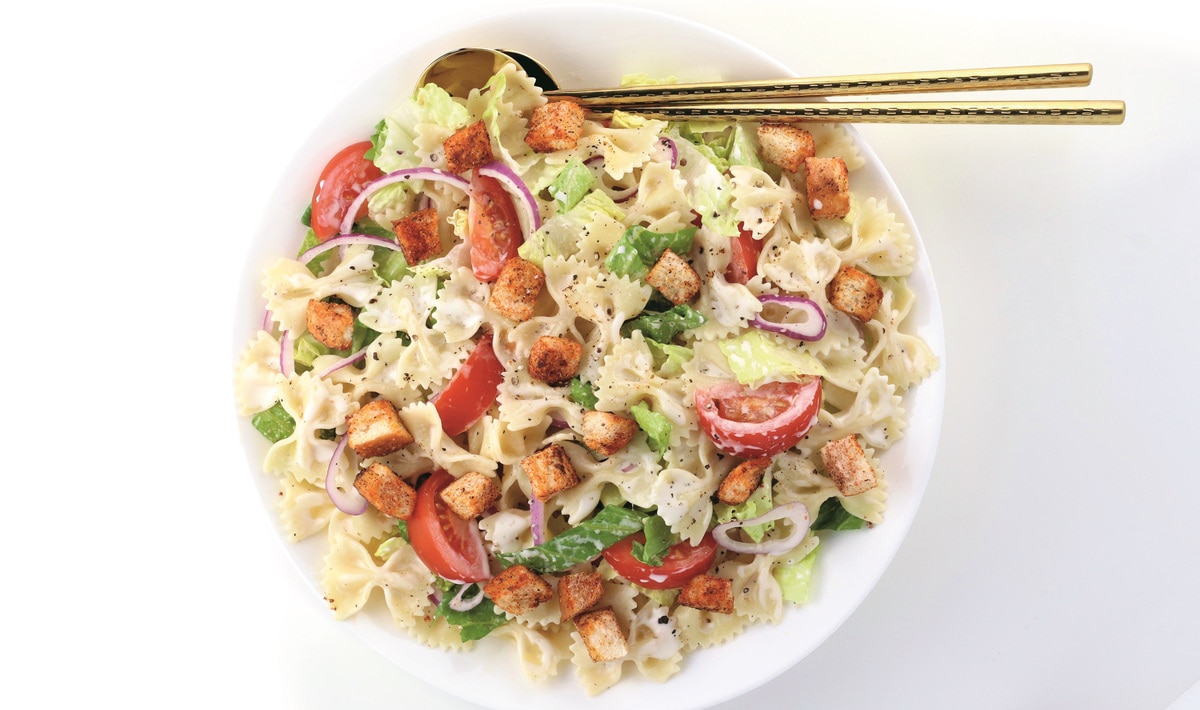 Crispy, seasoned croutons add buttery crunch to this simple pasta salad—from the Fast Easy Cheap Vegan cookbook—that’s guaranteed to add major deli vibes to your lunch. Make extra for topping your leafy green salads. You can thank us later.