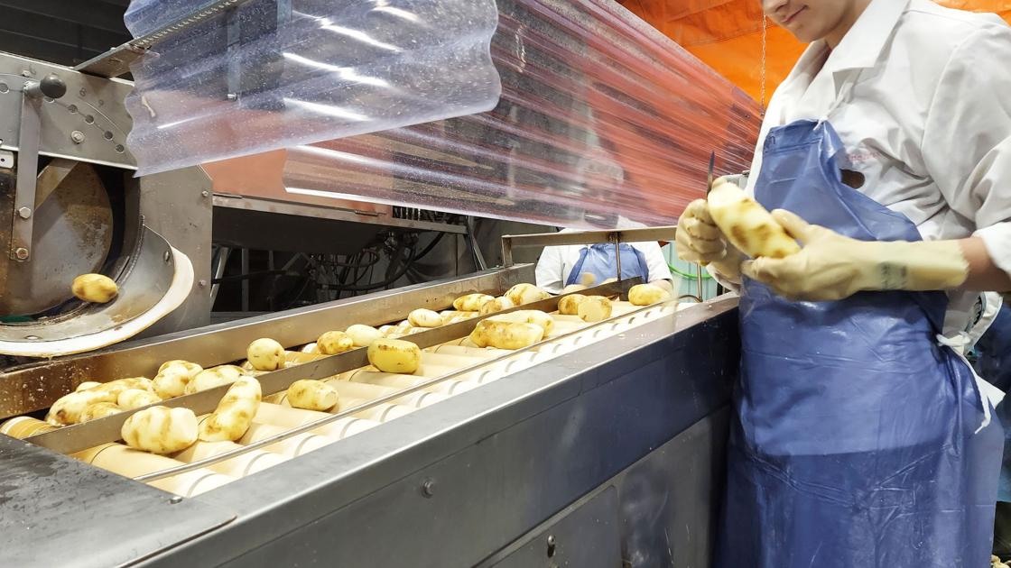 On a recent work day, Megan Bausch, daughter of Mark and Denise and sister of Kaleb, worked with other staff cutting up potatoes before they entered the blancher. Everybody wore a stylish white hairnet.