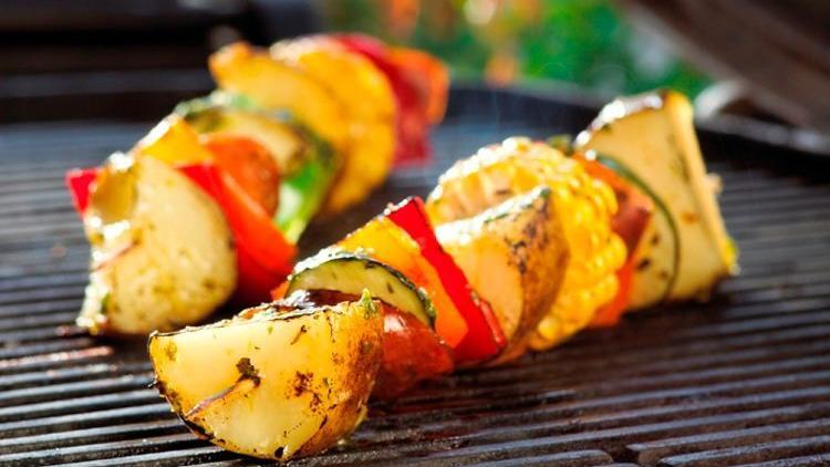 4. When cool enough to handle, cut the potatoes into large chunks. Thread potatoes, sausage and vegetables onto skewers. Wrap the exposed ends of the skewers with foil to prevent them from burning.